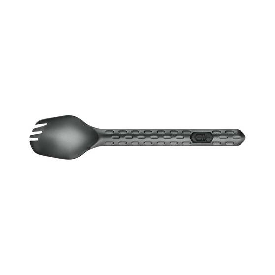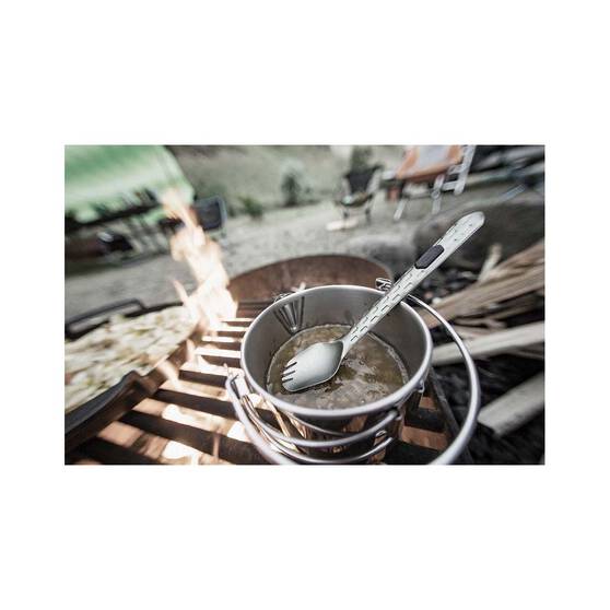 The Gerber Devour Multi-Fork with nine functions is the only tool you need to take on tour for cooking, eating, and cleaning! This lightweight multitool snaps together for secure portability and storage, and each tool works independently. Included tools are a serrated package opener, can opener, bottle opener, pry bar, flathead screwdriver [small], flathead screwdriver [large], deep basin spoon, offset long tine fork and a flat cut/scrape edge.
